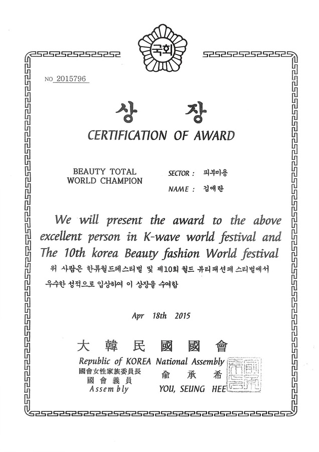 << SMC아카데미 수강생 >> 대한민국 국회 뷰티 토탈 월드 참피온상 수상 피부미용 부분 김애란님