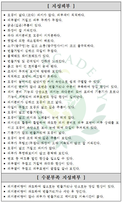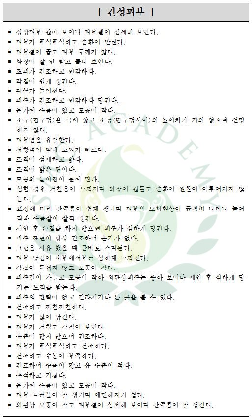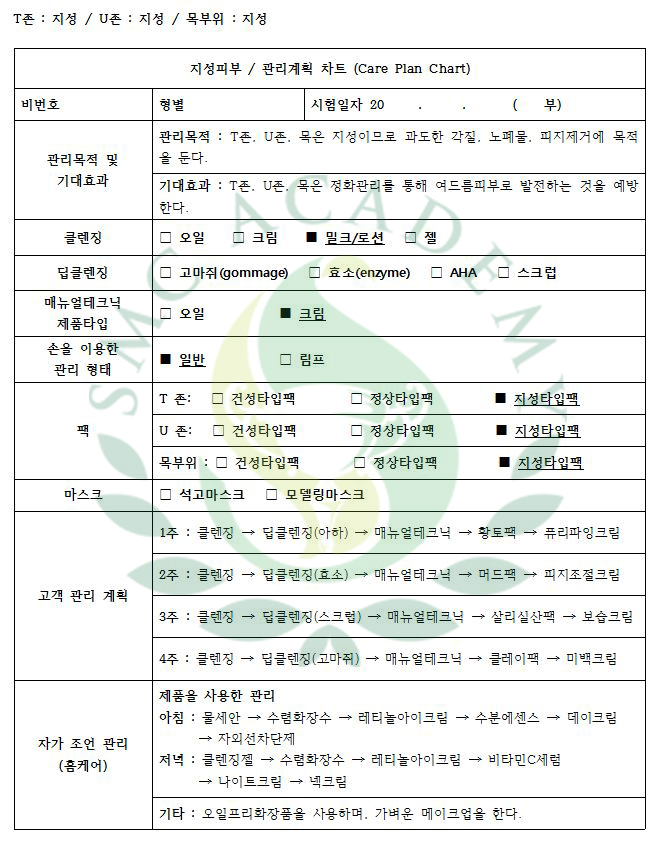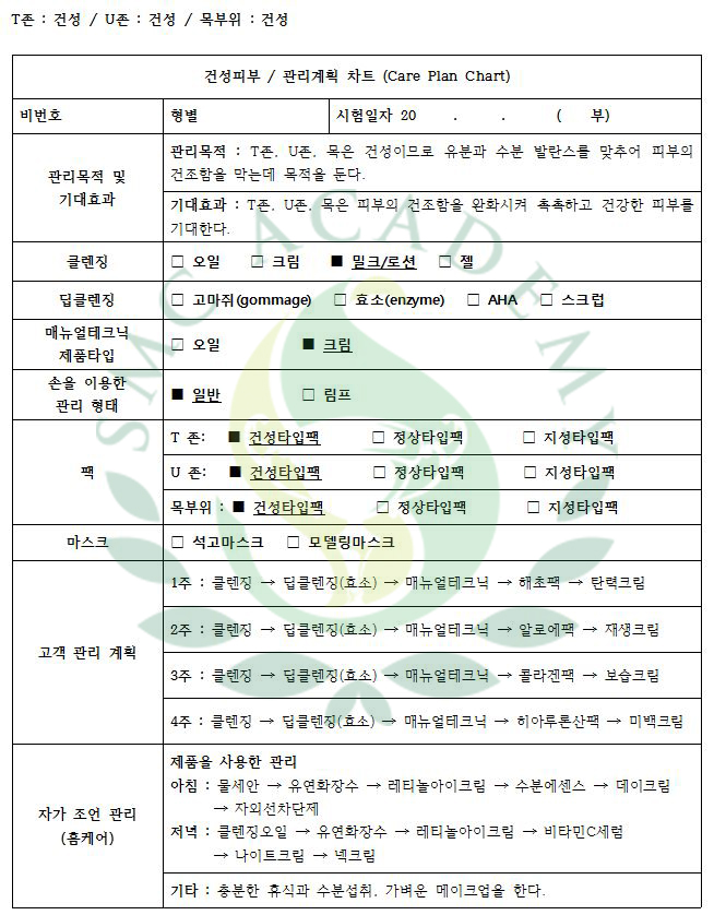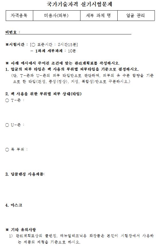 1. 피부미용사 국가자격증 관리계획표 작성은 어떻게 하나요? 당일 날 시험장에서 얼굴부위별 타입에 대한 내용과 사용할 딥클렌징제를 지정 (당일 시험장 측에서 제시함)하면 그에 따른 피부관리 계획표를 작성하게 되며, 이는 데려온 모델의 피부타입과는 관계 없이 이루어집니다. 그리고 이후의 작업은 모델의 피부타입과는 관계없이 피부관리계획표 상의 제품을 기준으로 수행하면 됩니다.