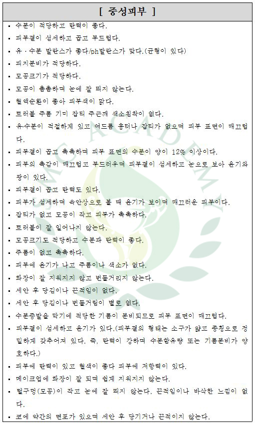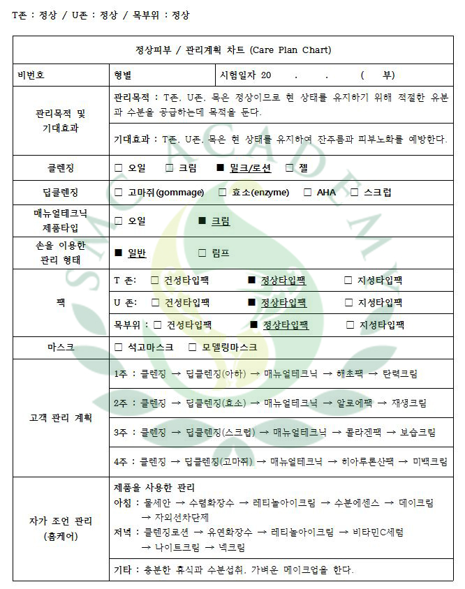 < 중성피부(정상피부) 관리계획 차트 샘플 >