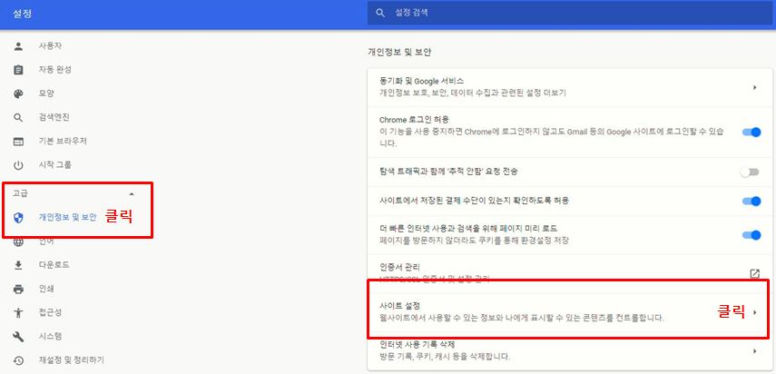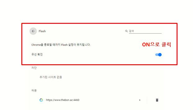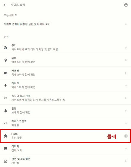 1. 크롬창에서 상단 우측에 있는 2. 설정을 클릭해주세요. 3. 고급 클릭 → 개인정보 및 보안 클릭 → 사이트 설정 클릭해주세요. 4. Flash 클릭해주세요. 5. 우선 확인이 될 수 있게 ON 으로 클릭해주세요. (파란색 버튼 클릭)
