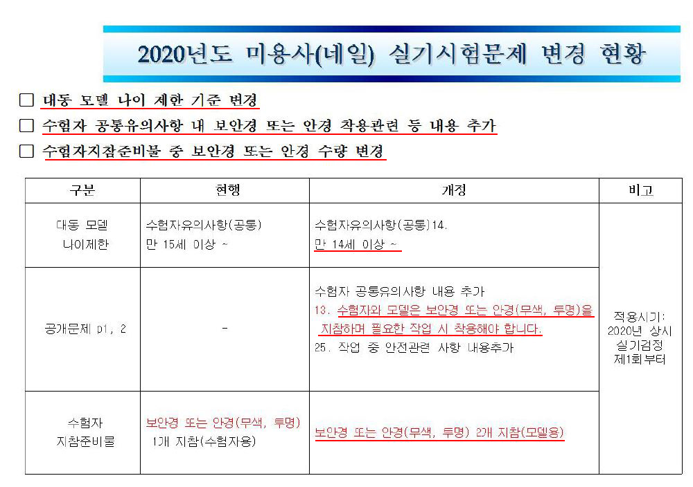2020년도 미용사(네일) 실기시험문제 변경 1. 모델 나이 제한 기준 변경 2. 수험자 공통유의사항 내 보안경 또는 안경 착용관련 등 내용 추가 3. 수험자 지참 준비물 중 보안경 또는 안경 수량 변경